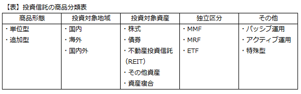 投資信託には、日本国内で発行されているだけでも数千種類の銘柄があり、【表】のように、商品形態、投資対象地域、投資対象資産によって区分できる。これらの区分を組み合わせた様々な商品が組成されており、投資家はニーズに応じて商品を選択することができる。